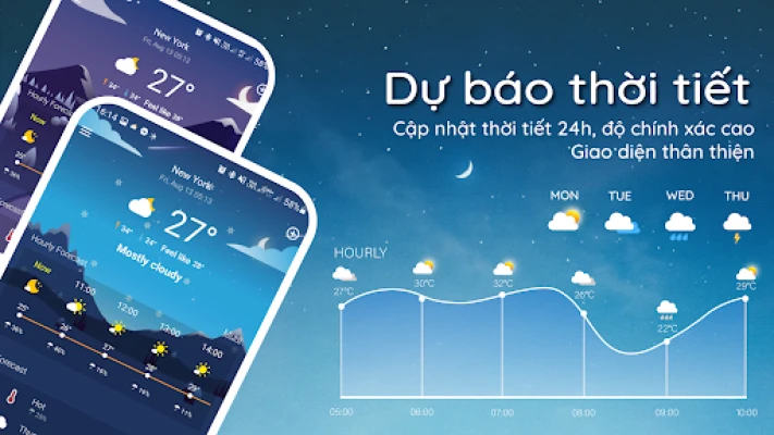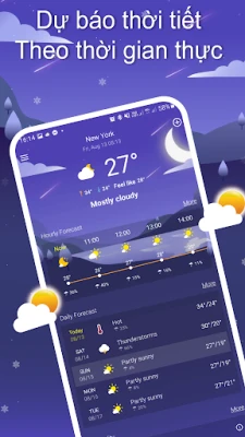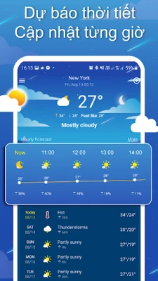 Dự báo thời tiết cung cấp một cái nhìn sâu sắc và kịp thời về các diễn biến khí hậu. Bạn sẽ nhận được thông tin cập nhật từng giờ về nhiệt độ, hướng gió, tốc độ gió, độ ẩm, tầm nhìn, và thời điểm mặt trời mọc/lặn, cùng các chỉ số liên quan đến thể thao ngoài trời. Để phục vụ mọi nhu cầu lập kế hoạch, ứng dụng còn hỗ trợ dự báo chi tiết trong 24 giờ tới, giúp bạn chủ động chuẩn bị cho buổi hẹn hò hay công việc. Hơn thế nữa, các dự báo dài hạn từ 7 đến 25 ngày sẽ là trợ thủ đắc lực cho những chuyến đi xa, kỳ nghỉ hay các sự kiện quan trọng, đảm bảo mọi kế hoạch của bạn diễn ra suôn sẻ, không lo ngại bất ngờ từ thời tiết.