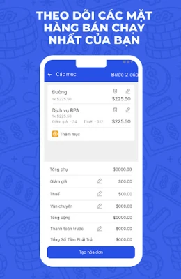 Hóa đơn: Smart Receipt Maker giúp bạn dễ dàng tạo, gửi hóa đơn và quản lý ước tính chuyên nghiệp. Theo dõi dòng tiền, sử dụng các mẫu hóa đơn thông minh để không bỏ lỡ khoản thanh toán và được khách hàng thanh toán nhanh chóng. Đơn giản hóa quy trình thanh toán cho doanh nghiệp của bạn.
