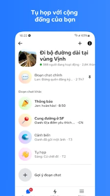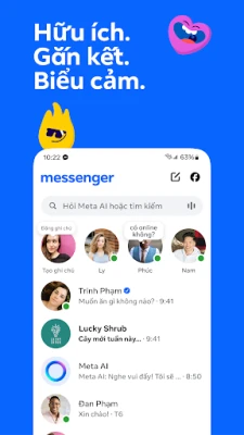 Messenger là cầu nối di động không thể thiếu, giúp bạn duy trì liên lạc với bạn bè và gia đình trên Facebook dù họ ở bất cứ đâu. Không còn bị ràng buộc bởi số điện thoại, bạn có thể dễ dàng bắt đầu các cuộc trò chuyện ý nghĩa hoặc những cuộc gọi rõ ràng, mang mọi người lại gần nhau hơn. Khám phá vô vàn cách thể hiện bản thân, từ những nhãn dán động vui nhộn đến các biểu tượng cảm xúc đa dạng, làm cho mỗi tin nhắn trở nên sống động và chân thực hơn. Messenger trao quyền cho bạn kiểm soát nội dung, cho phép chỉnh sửa tin nhắn đã gửi trong vòng 15 phút hoặc sử dụng tính năng tin nhắn tự hủy để đảm bảo quyền riêng tư tối ưu cho những cuộc trò chuyện quan trọng.